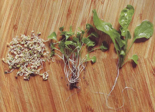 In the photo below, you can see sprouts on the left, microgreens in the middle, and a more mature vegetable plant on the right: